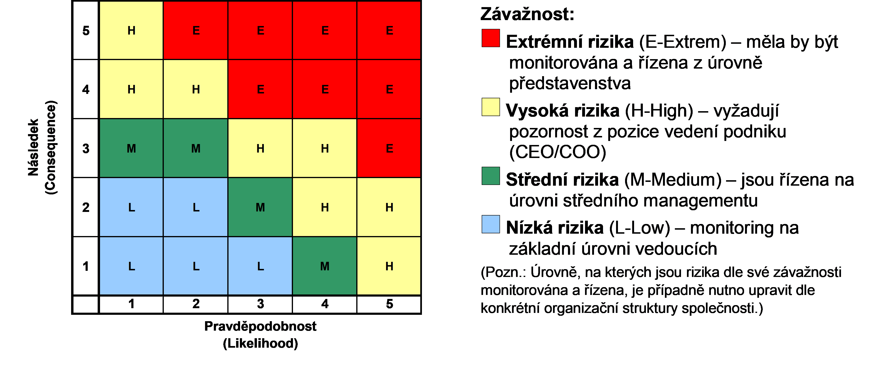 Výstupem je mapa rizik, kde je každému riziku na základě pravděpodobnosti výskytu a závažnosti následků přiřazena výsledná závažnost (pozice v mapě rizik).