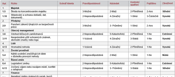 Výstupem z mapy rizik je registr – dokument, jehož součástí je i přehledný seznam s hlavními charakteristikami jednotlivých rizik. Může vypadat například takto: